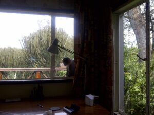 De migratieroutes van de wilde dieren zijn afgesloten door nieuwe nederzettingen. Een nieuwe buurman gaat vijf huizen op zijn erf bouwen, met een elektrisch hek er omheen. We schilderen nu maar dieren op onze buitenmuren. Een eekhoorntje dat over mijn bureau trippelt, het gekwetter van kleurrijke vogels, een uil die met me meedenkt in de avonduren, zij zijn de enige dieren die me nog verwennen met hun aanwezigheid.